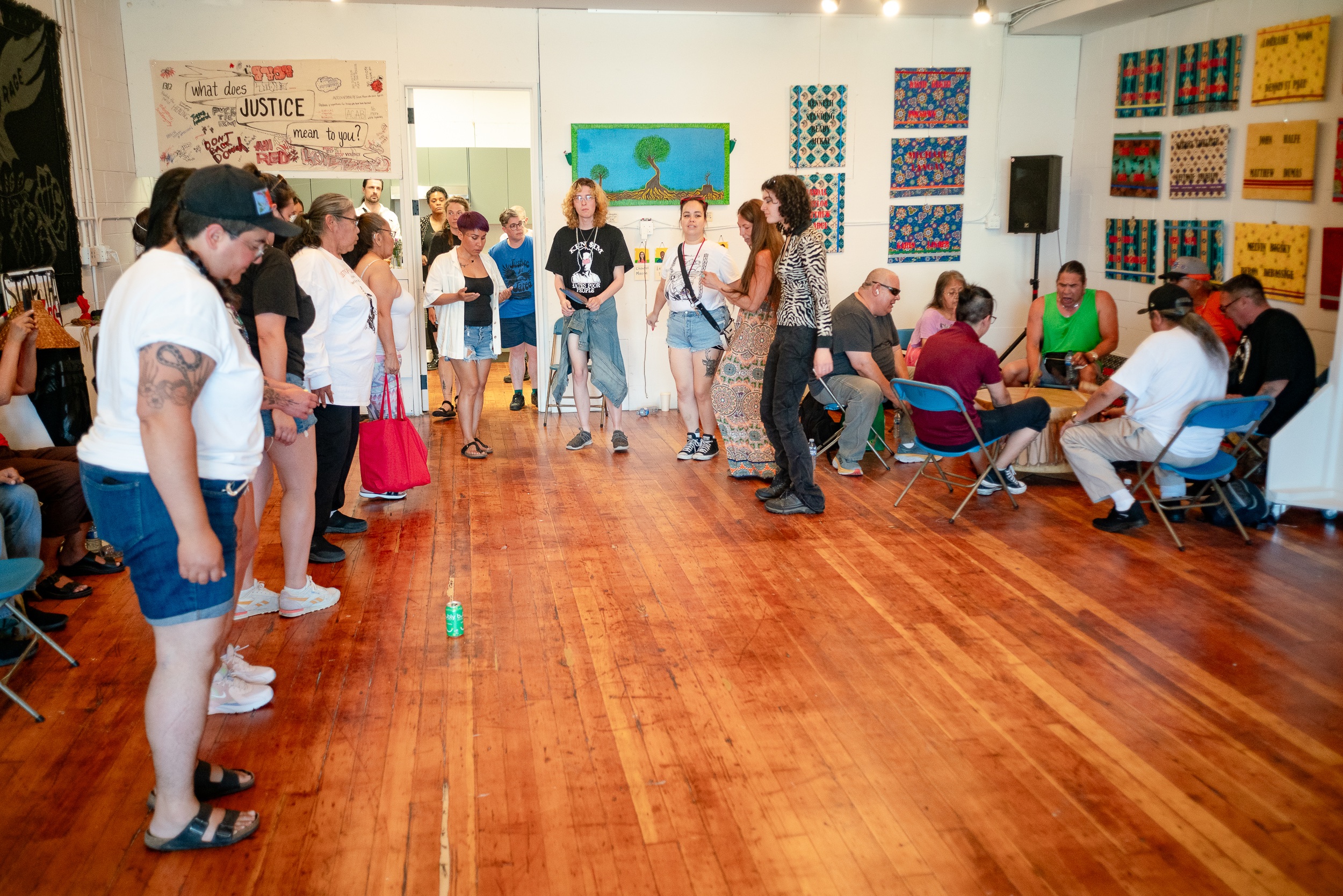 Led by Laura, the mother of Jared Lowndes, the Wetʼsuwetʼen man who was murdered by the police in 2021, J4J included a ribbon skirt exhibition and concert as a memorial for those we have lost to police brutality. We were able to hold a healing space in the Downtown Eastside (DTES) to honour Jared. This jam packed event brought medicine from the big drum and shared a traditional salmon meal with the people, reminding one another that we aren’t alone.